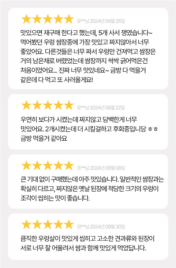 ★후기검증완료★ TV보다가 우렁쌈밥식당 나온거 보고 찾아갈까 했는데 넘 멀어서 대신 우럼쌈장 배달시켰어요 ㅎㅎ 고기먹을 때 먹어봤는데 짜지않고 완전 맛있어요~