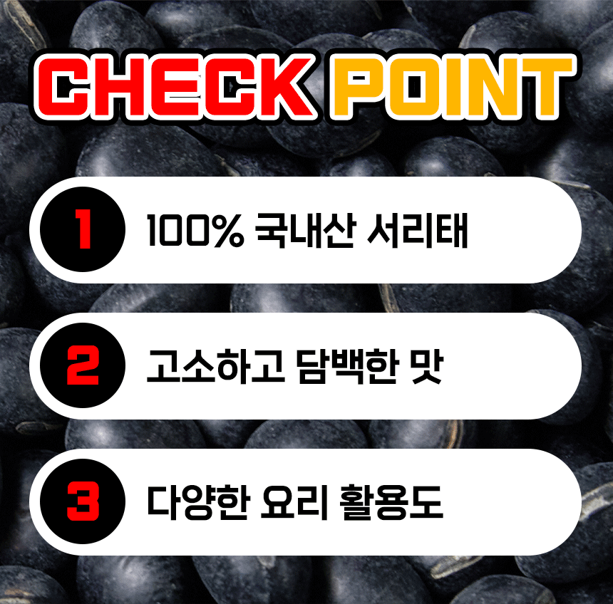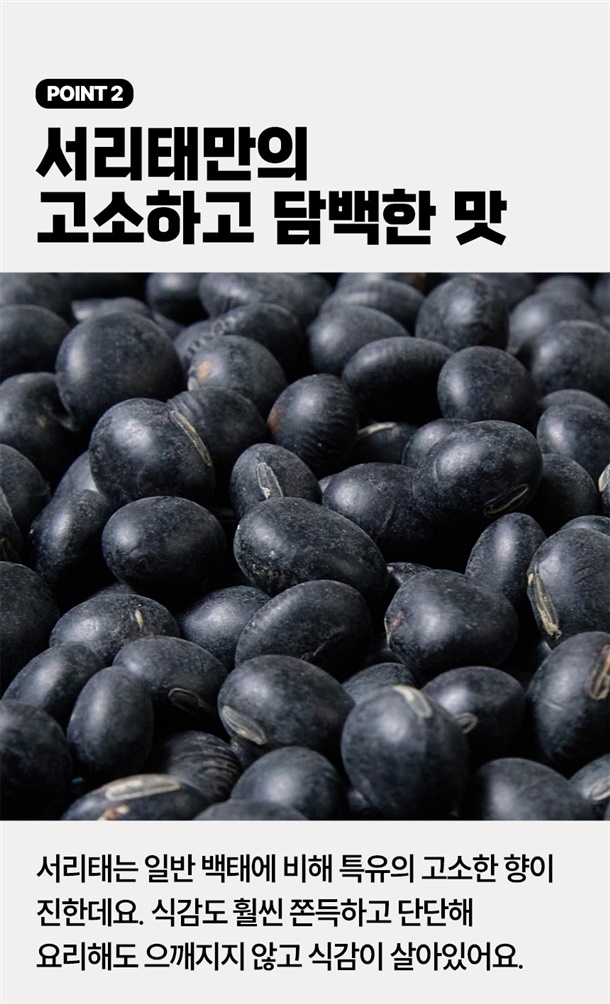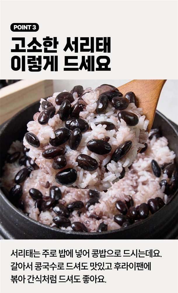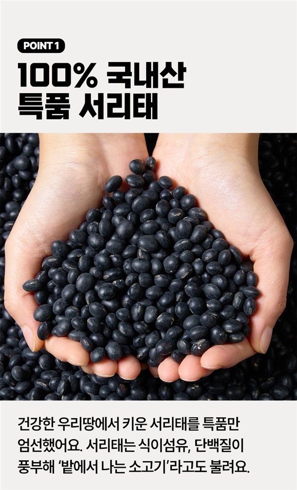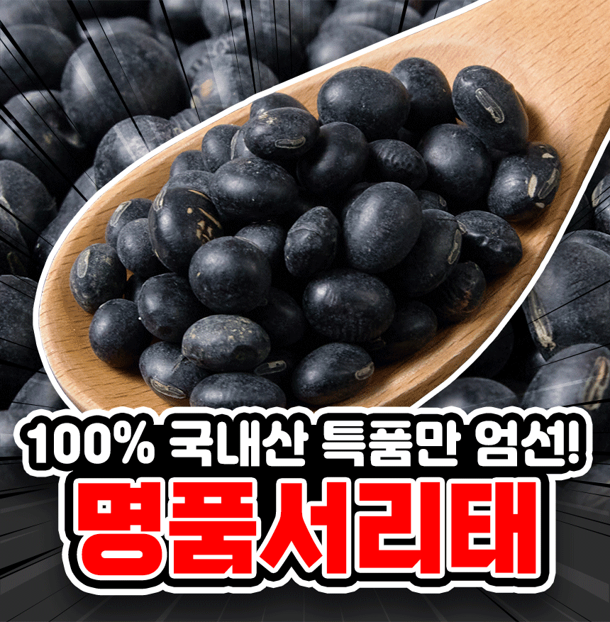 땅에서 나는 고기라는 별명을 가진 콩으로 영양성분이 풍부한 블랙푸드의 선두주자에요. 검은콩 중에 가장 알이 크고 달달 담백한 서리태를 확인해보세요!