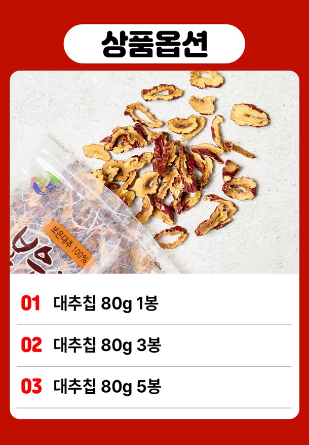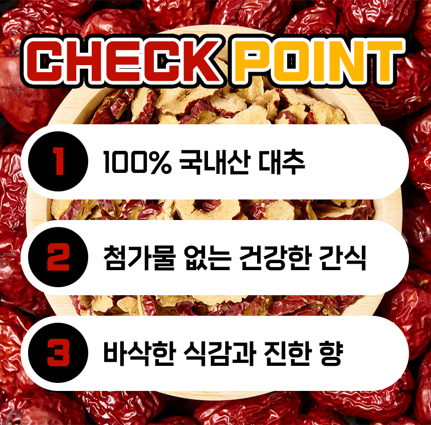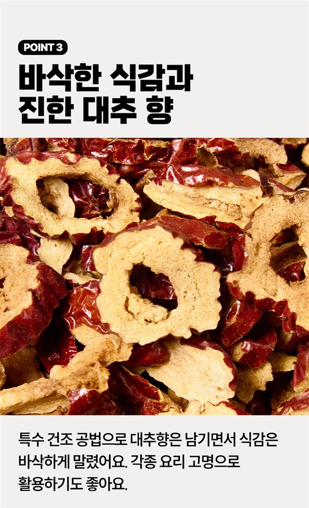 충북 보은의 햇살을 머금은 대추를 한 장 한 장 정성껏 말려 만든 대추칩이에요! 바삭한 식감 속에 자연스러운 달콤함이 더해져 건강한 간식으로 제격이에요~!