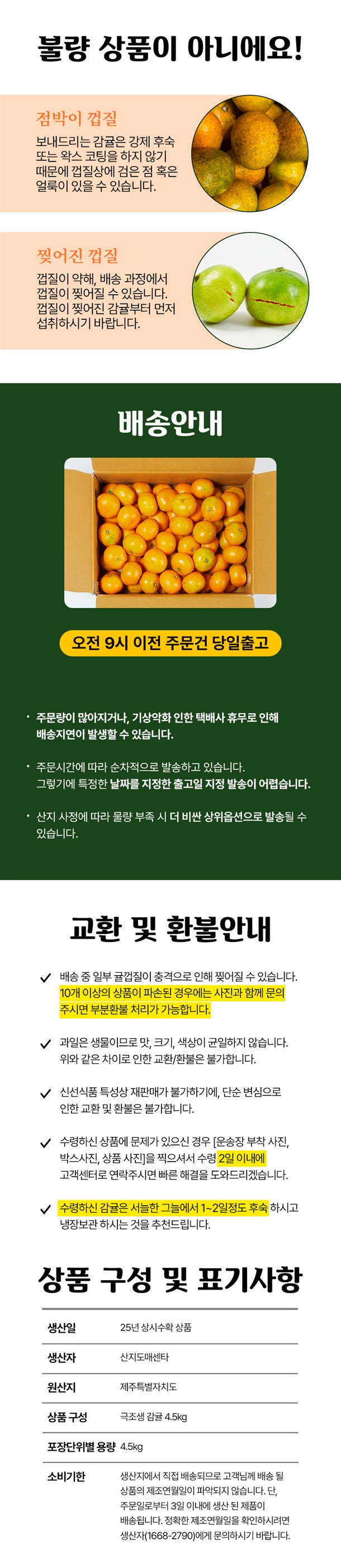 경매가 높기로 소문난 33명 감귤 장인들 귤밭에서 하나하나 엄선했구요. 제주 앞바다 해풍맞은 감귤이라 병충해 없이 잘 자랐어요~ 당연히 강제착색, 코팅 없구요. 자연 그대로 재배했습니다.