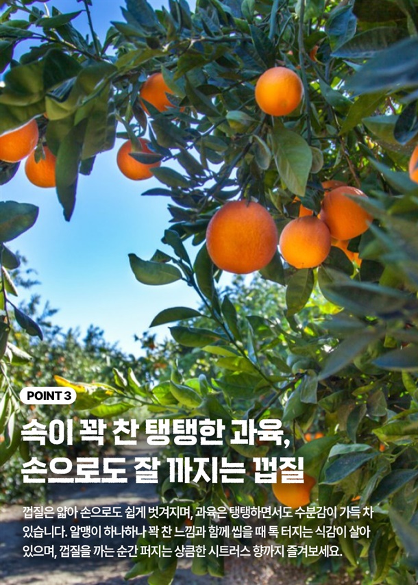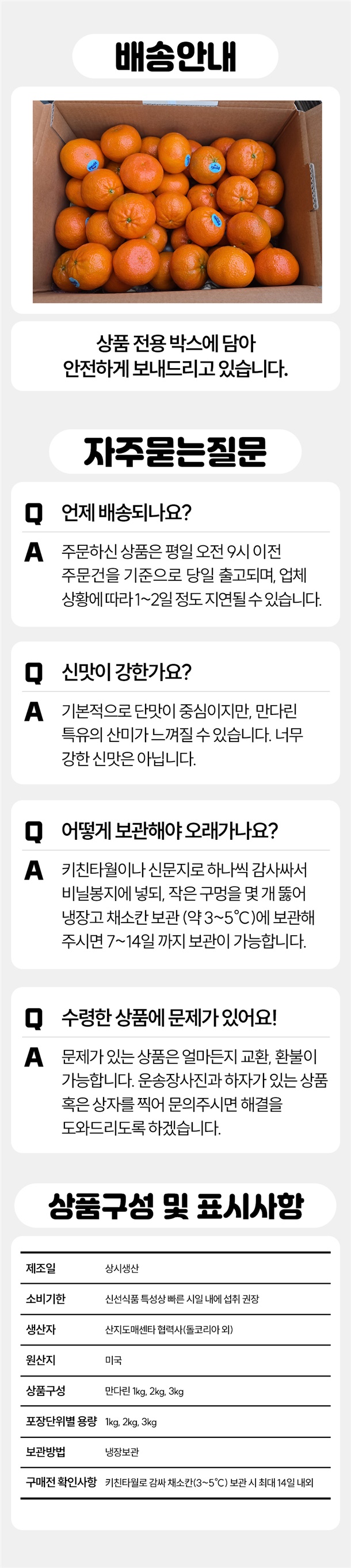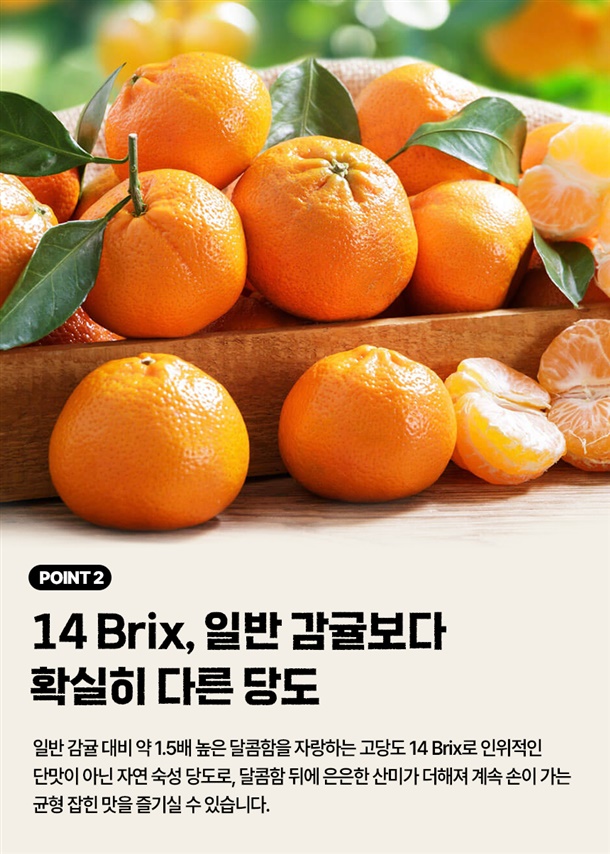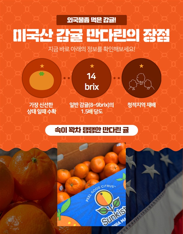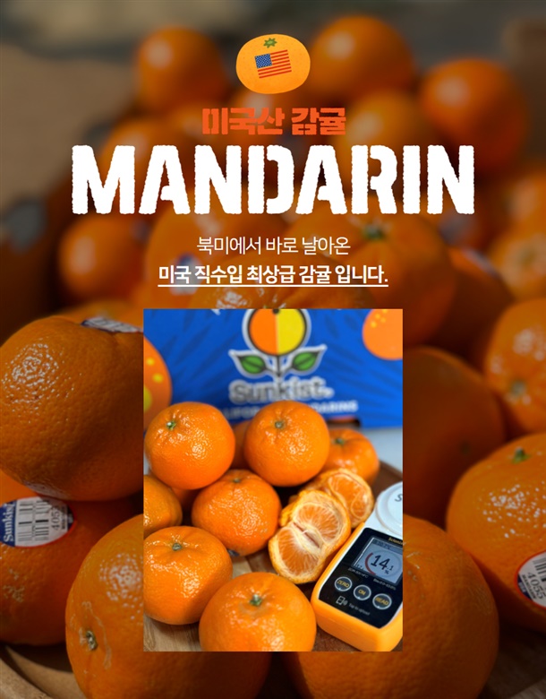 북미에서 바로 날아온 미국 직수입 최상급 감귤 드셔보세요~ 최대 14Brix로 일반 감귤 대비 1.5배나 높은 달콤함을 자랑해요 달콤함 뒤에 만다린의 은은한 산미가 더해져 계속 손이 가는 맛이에요!