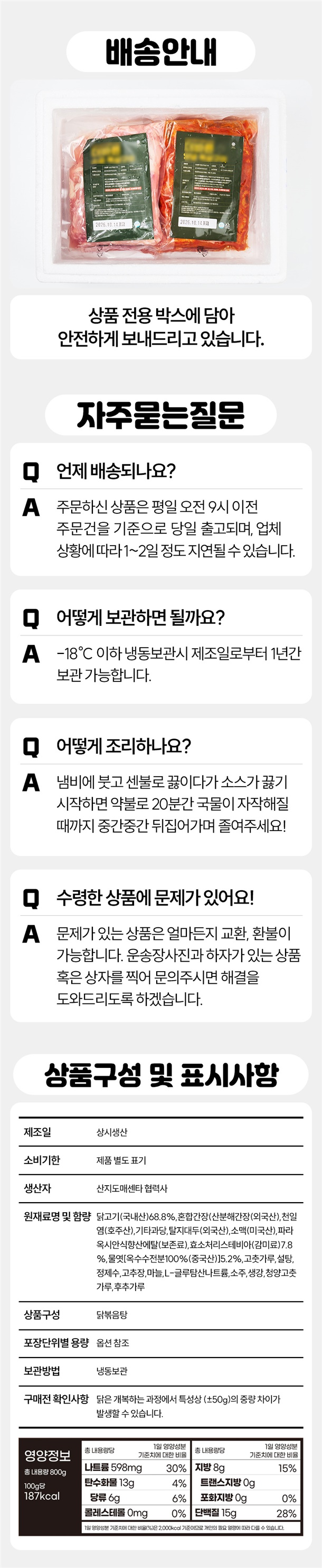 국내산 A급 닭만 엄선해 만들었구요~ 20년 경력 셰프의 특제 소스로 매콤한 감칠맛이 끝내줍니다! 48시간 저온숙성해 속까지 양념이 잘 배어있어요👍