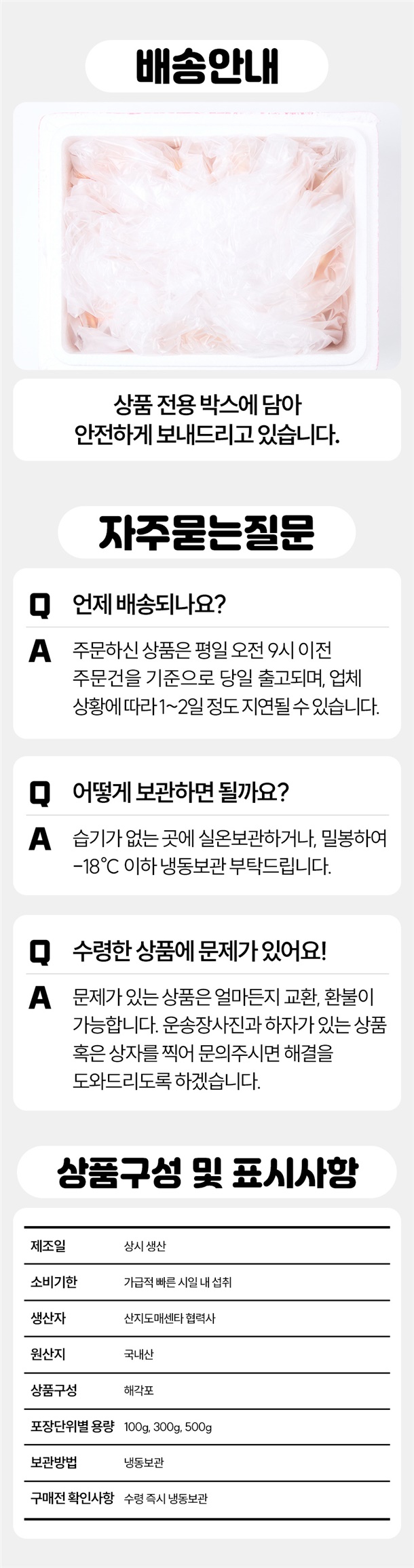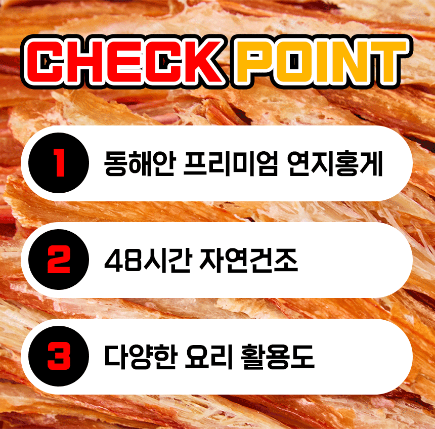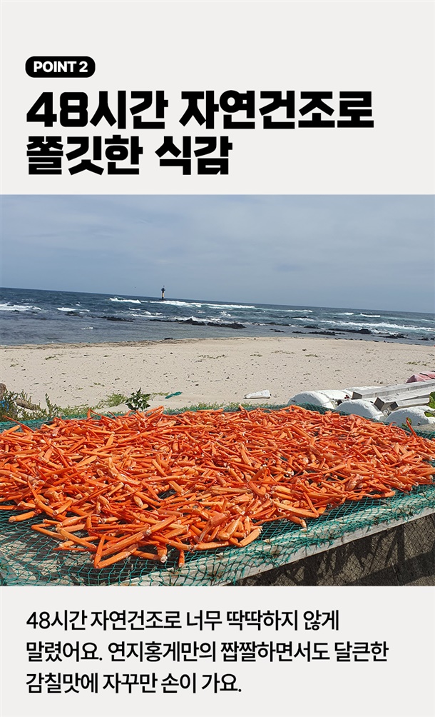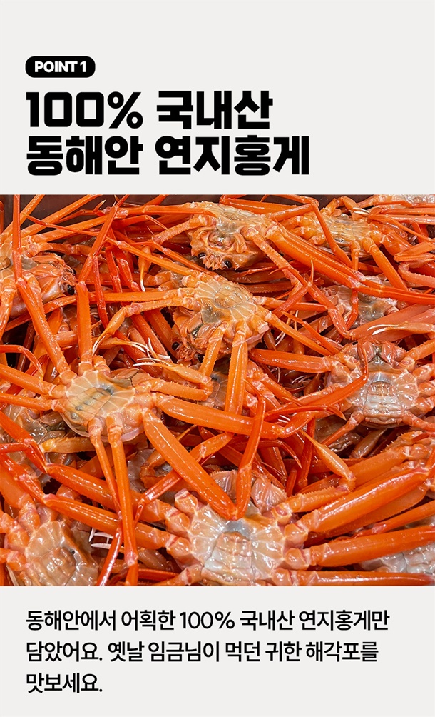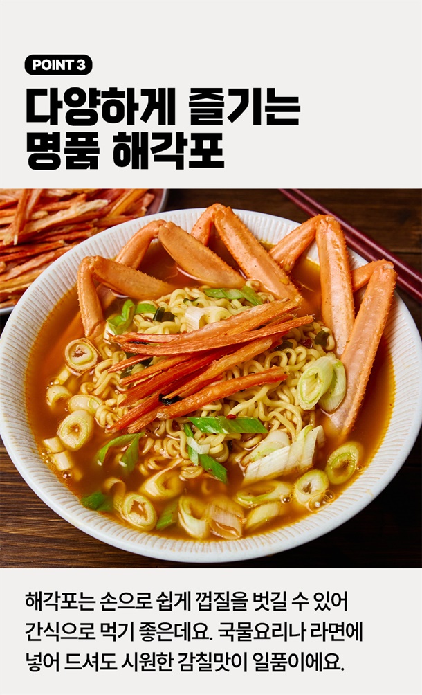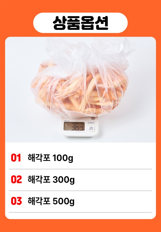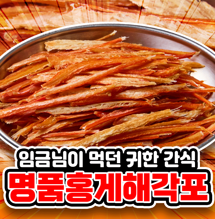 임금님의 간식으로 유명한 해각포! 동해안에서 어획한 100% 국내산 연지홍게를 건조해 만들었어요. 쫄깃쫄깃 짭조름하니 계속 손이 가실걸요~? 통 해각포 껍질은 라면이나 육수낼 때 넣으셔도 좋아요~