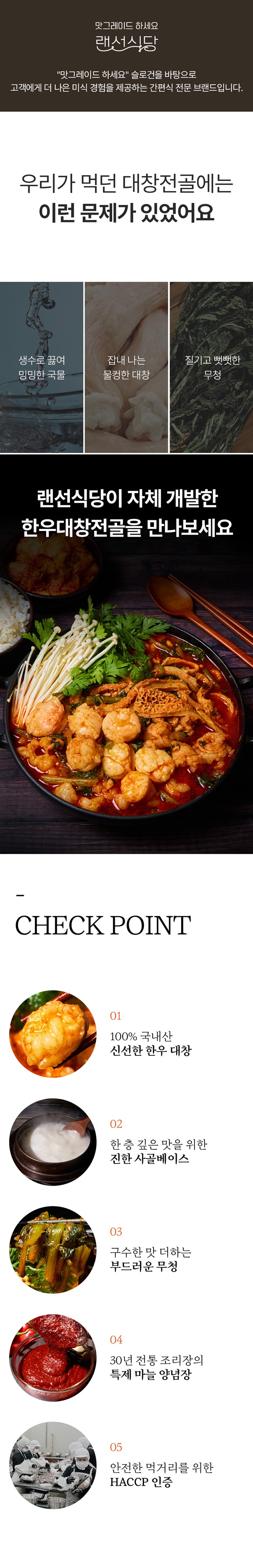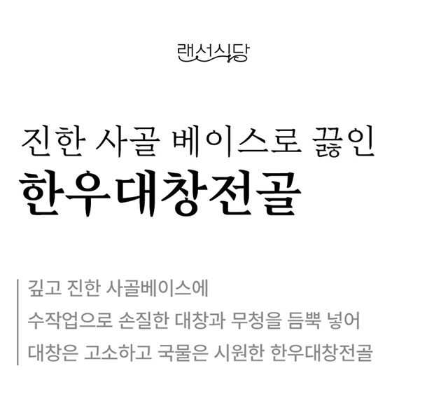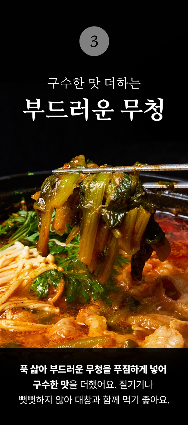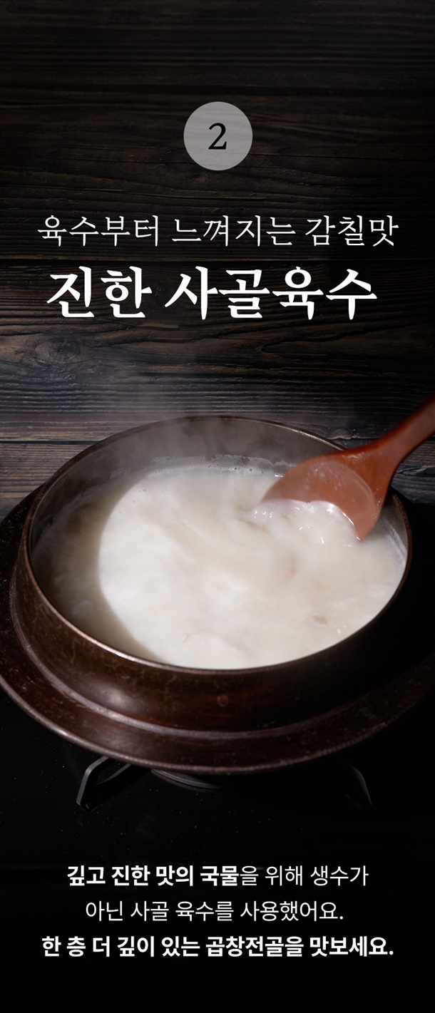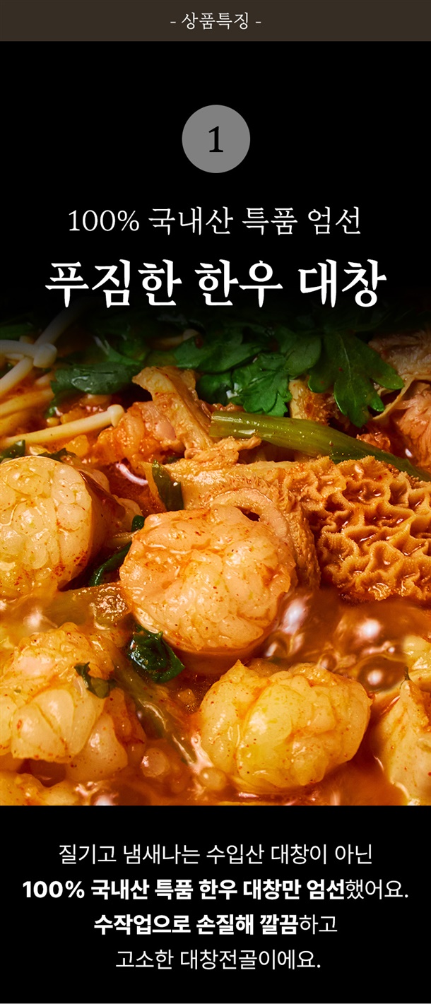 수작업으로 손질해서 깨끗하고 고소한 맛이 일품인 100% 한우 대창과 쫄깃한 소내장을 아낌없이 넣어서 건더기가 푸짐해요. 칼칼하고 진한 육수와 대창기름이 끓일수록 어우러져 풍미가 일품입니다.