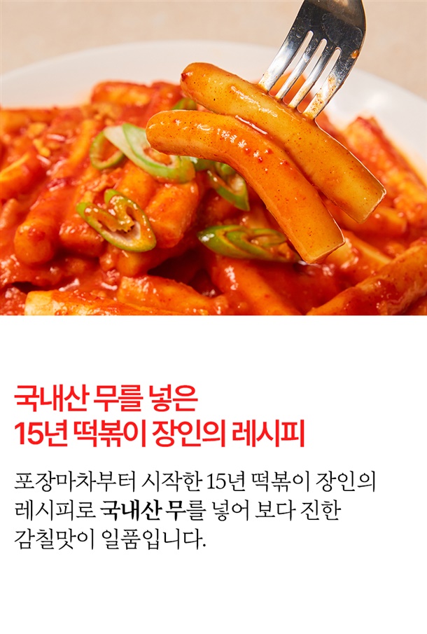 바로 뽑아낸 밀떡으로 쫄깃함이 살아있구요. 노점에서부터 15년간 떡볶이 연구한 달인의 레시피에 100% 국내산 무 넣어서 국물이 시원합니다!