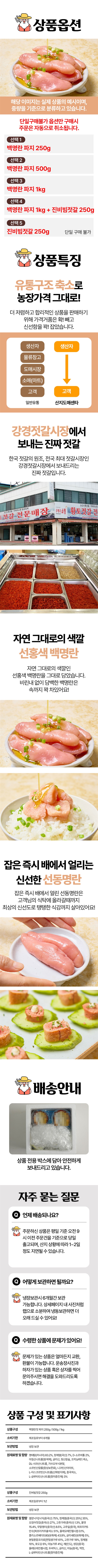 국내 최대 젓갈시장인 강경도매시장에서 바로 직송해서 가격이 착해요~ 거래처도 많아서 묵은재고가 있을 틈이 없어서 신선도가 끝내주고 비린맛도 없구요~ 신선도 보장하는 선동 백명란젓 한번 드셔보시면 다른 명란젓은 못드실거예요!