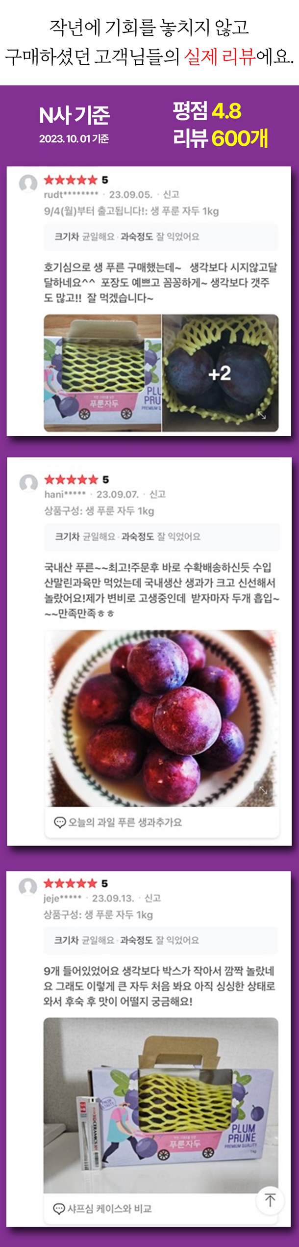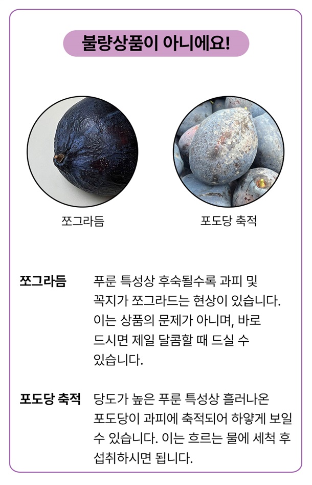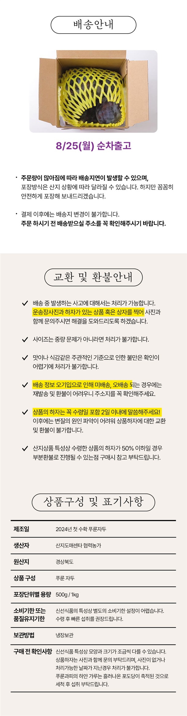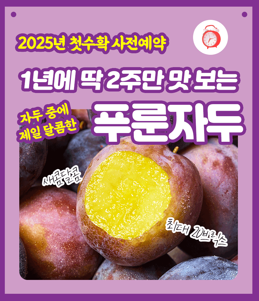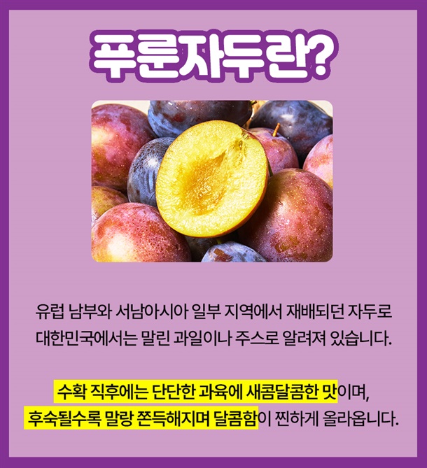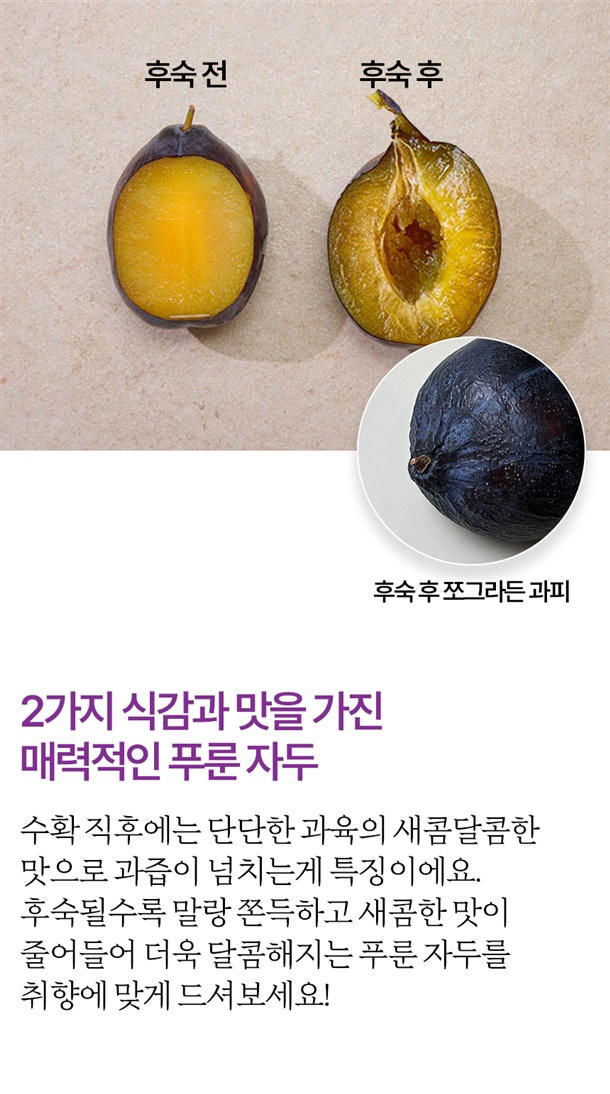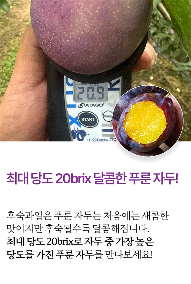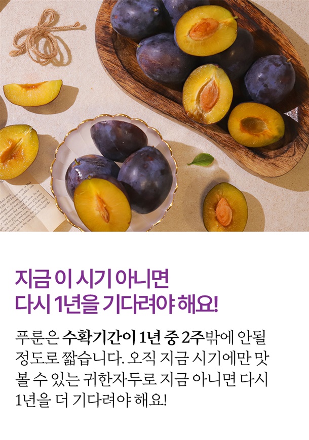 백화점 들어가는 물량 중에 소량만 겨우 받아왔습니다! 생 푸룬자두는 최대 20브릭스까지 나오는 자두 중 최고 당도를 자랑해요. 푸룬자두는 후숙과일이라 조금 쪼글쪼글해질때까지 기다렸다가 드시면 되구요~ 한번 드셔보시면 매년 이때만 기다리실꺼예요!
