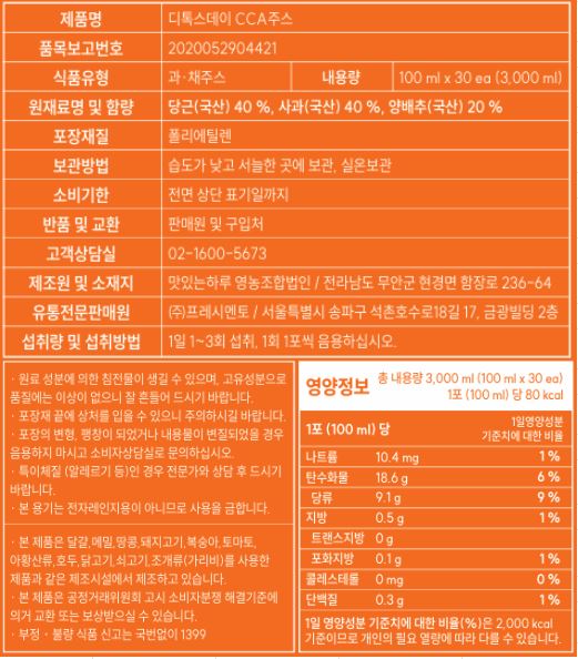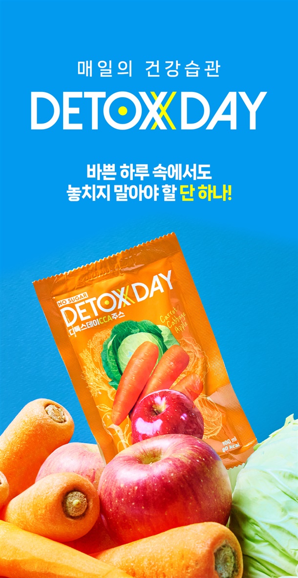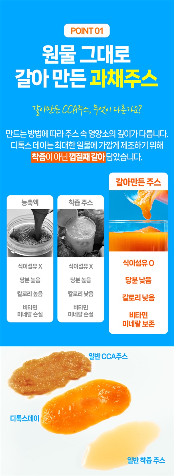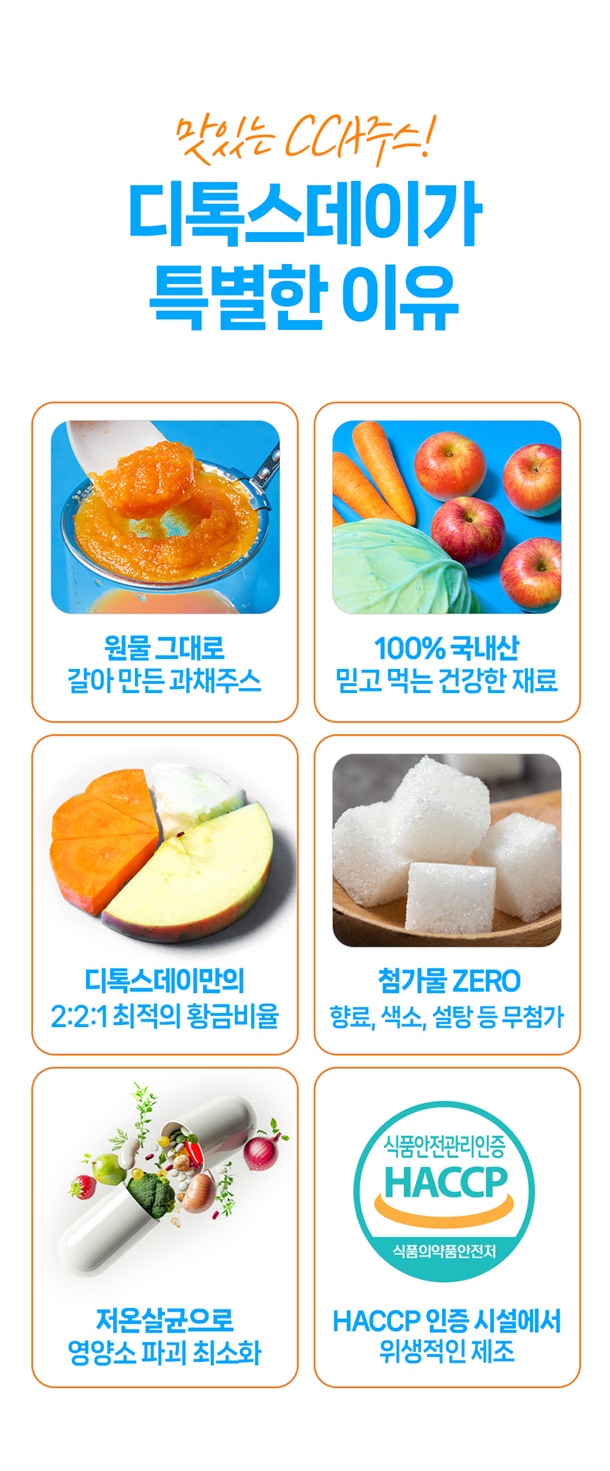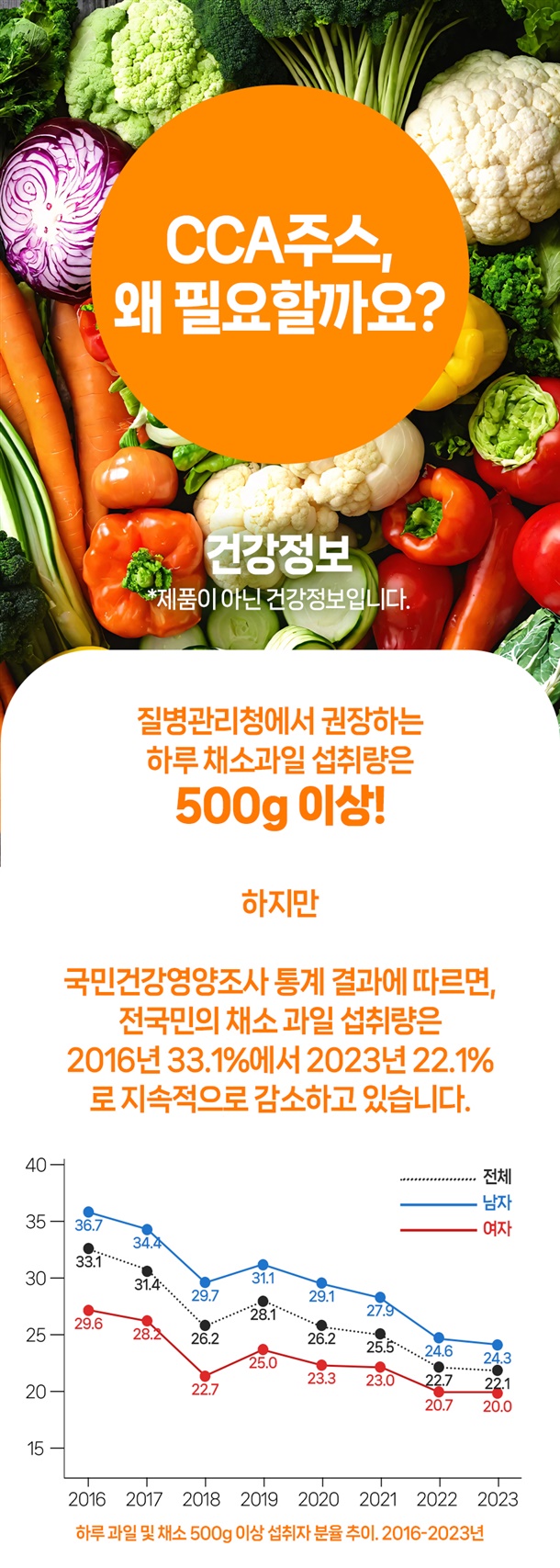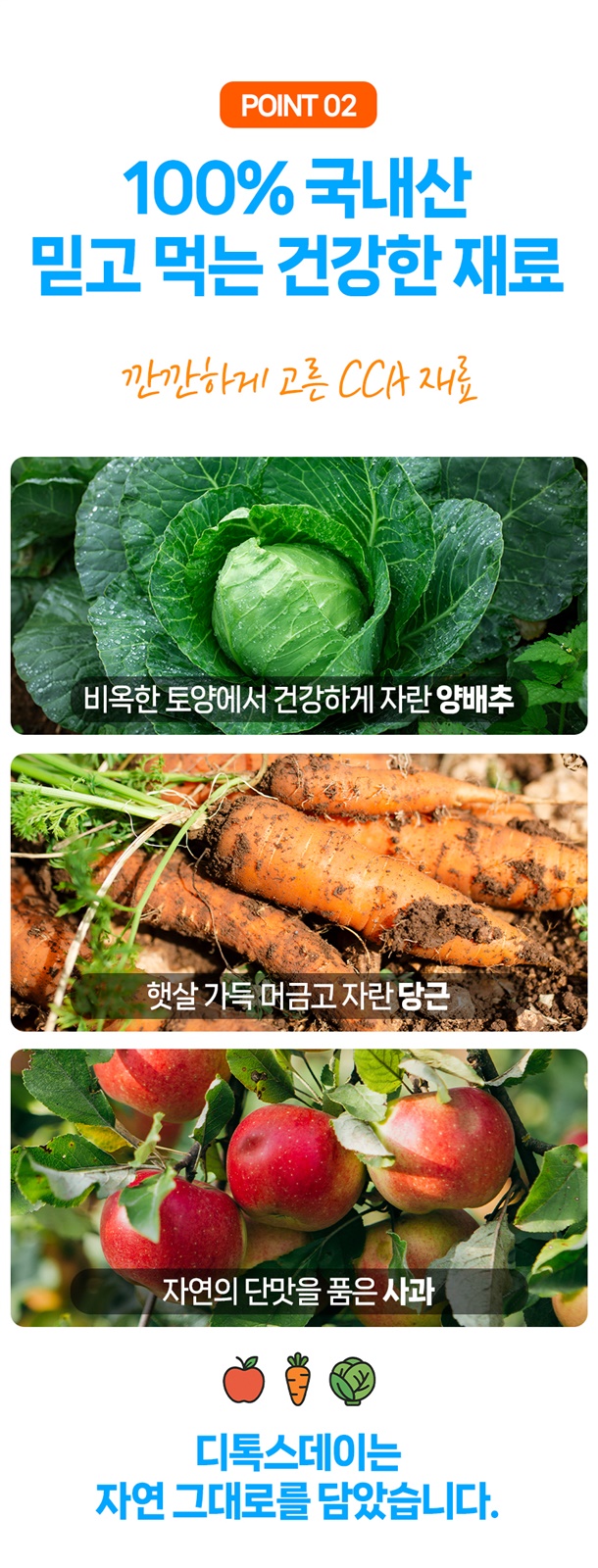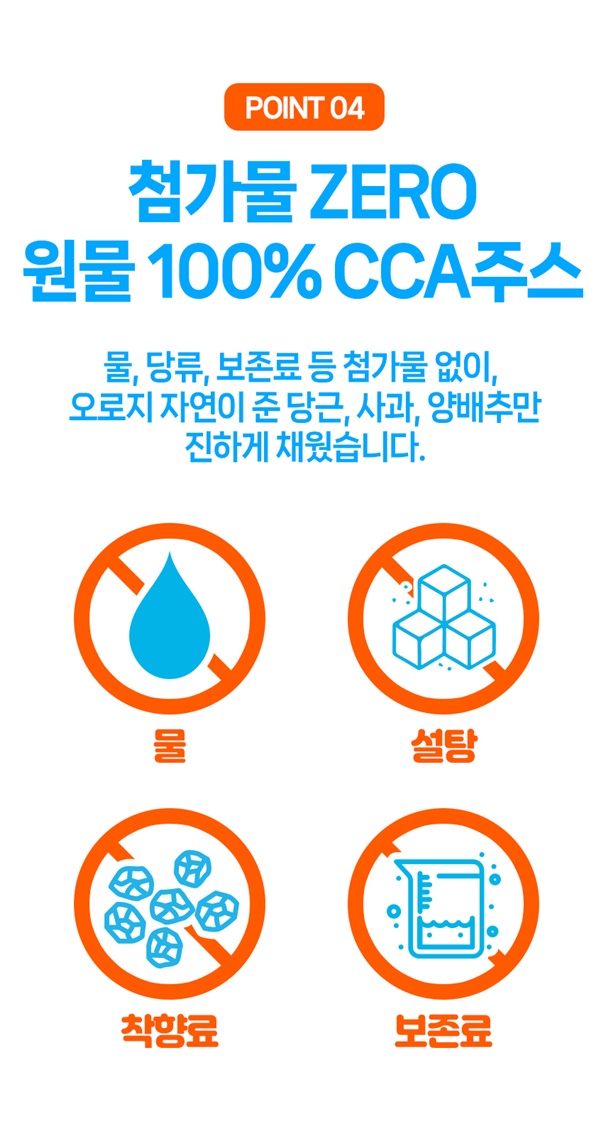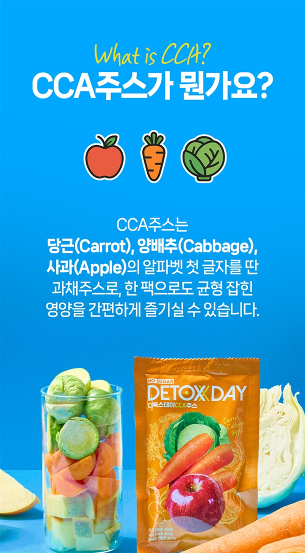 하루 한 잔으로 건강한 생활 습관을 만들 수 있도록 100% 국내산 양배추, 당근, 사과를 껍질째 통째로 갈아 넣은 CCA주스를 준비했습니다