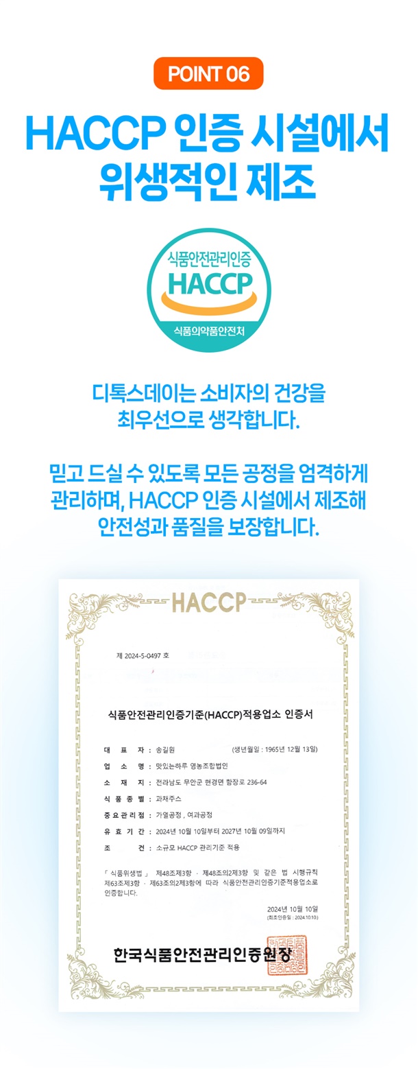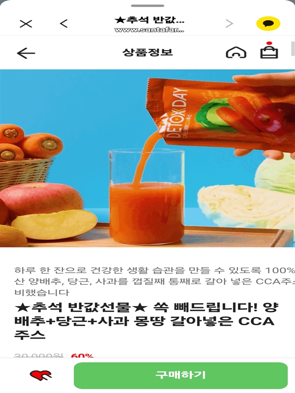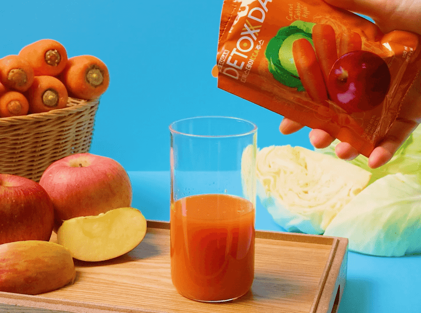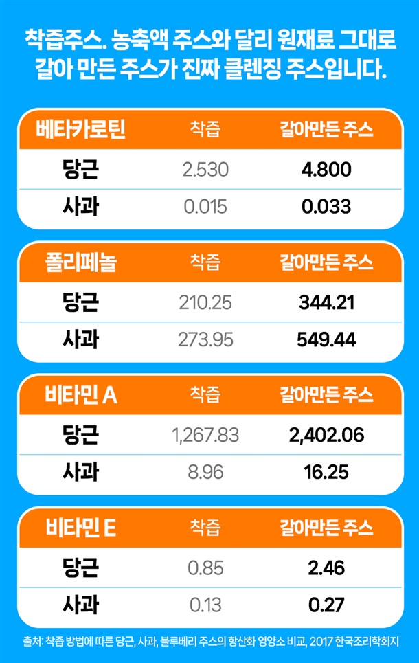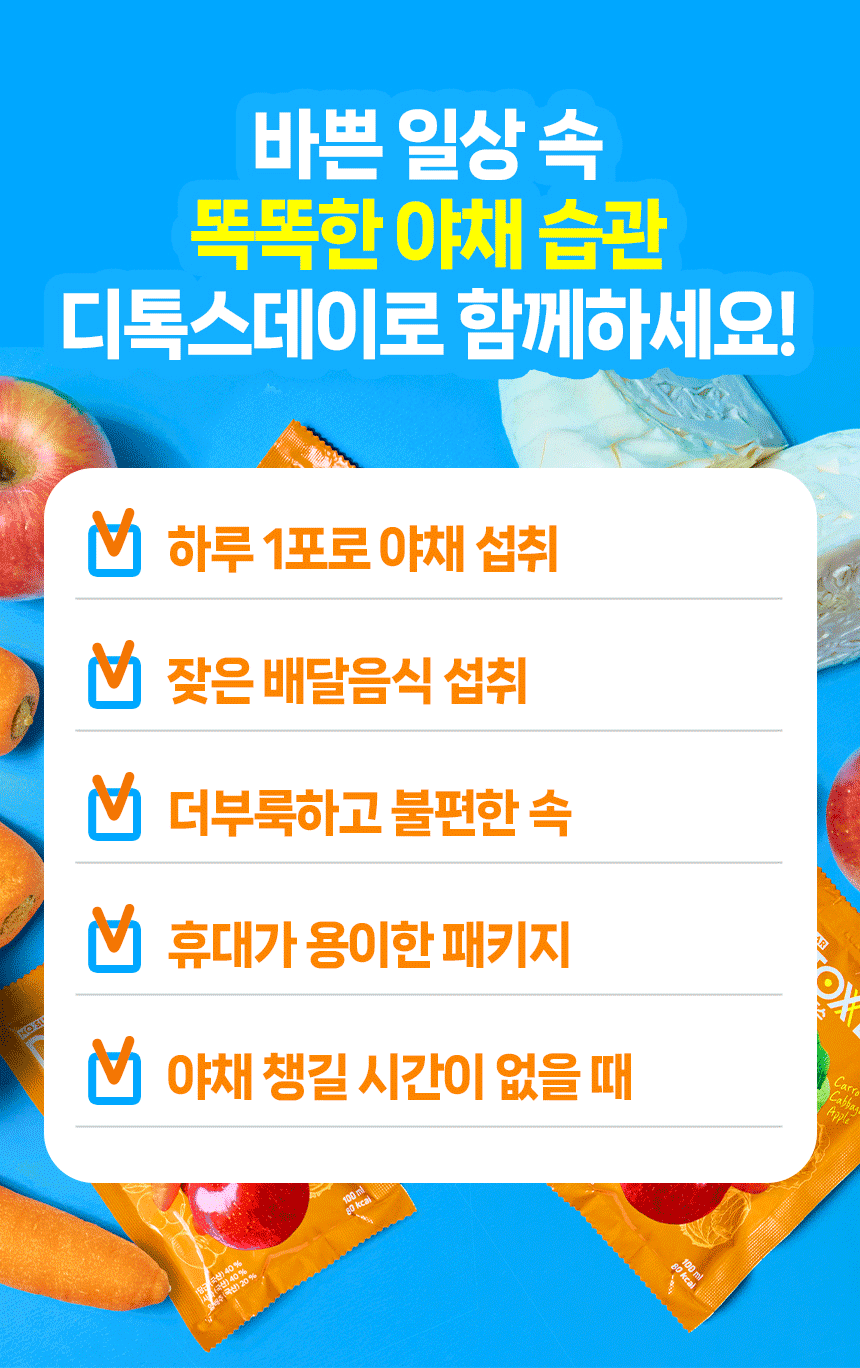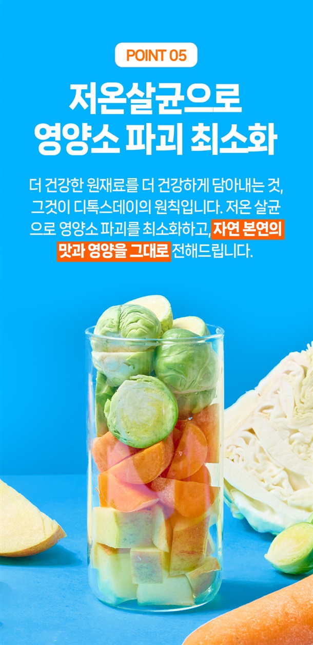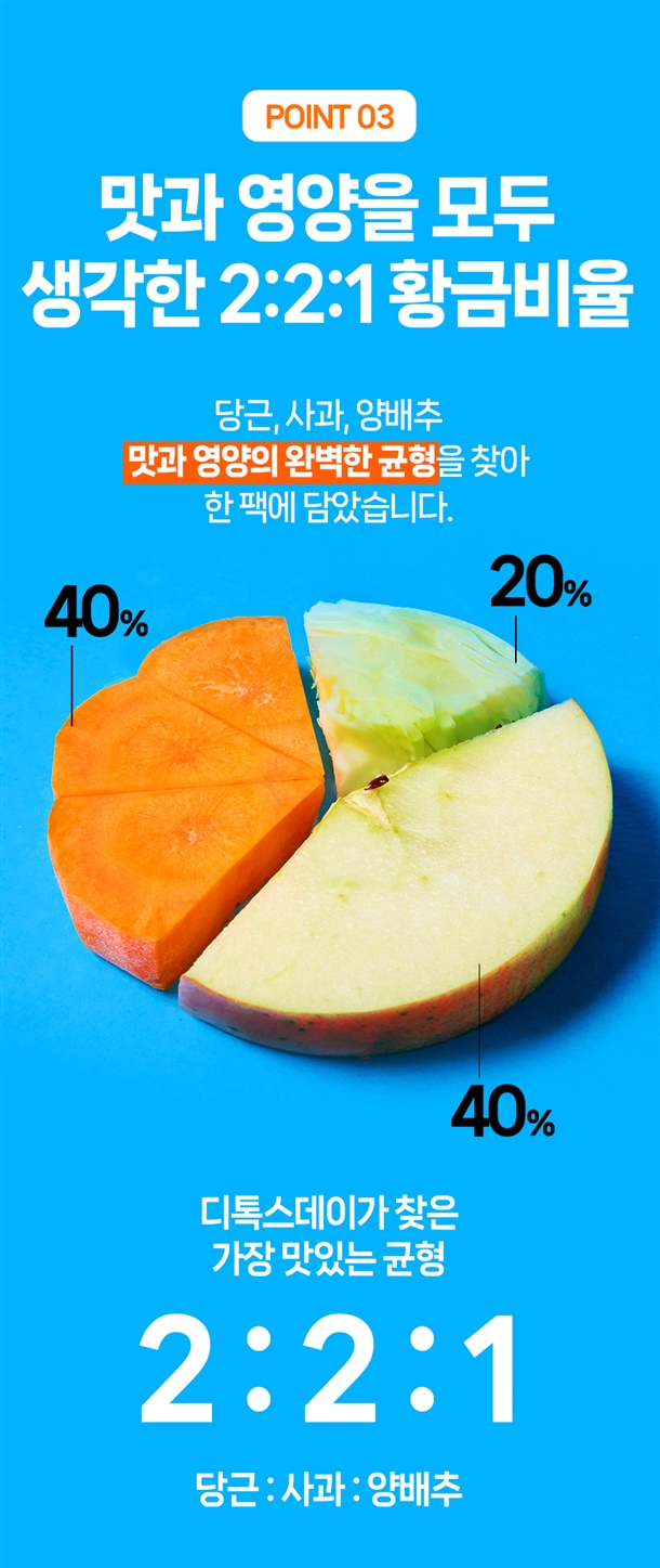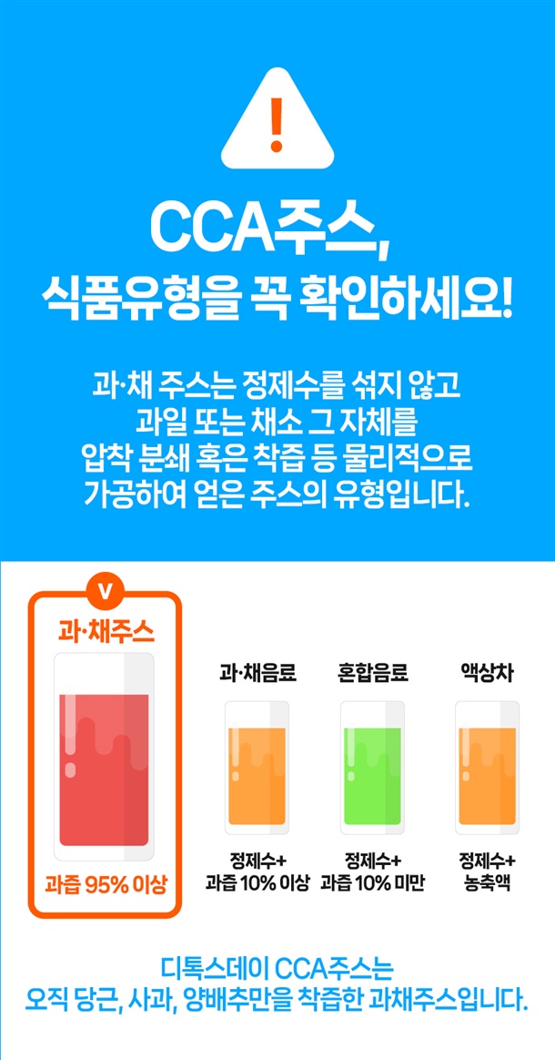 하루 한 잔으로 건강한 생활 습관을 만들 수 있도록 100% 국내산 양배추, 당근, 사과를 껍질째 통째로 갈아 넣은 CCA주스를 준비했습니다