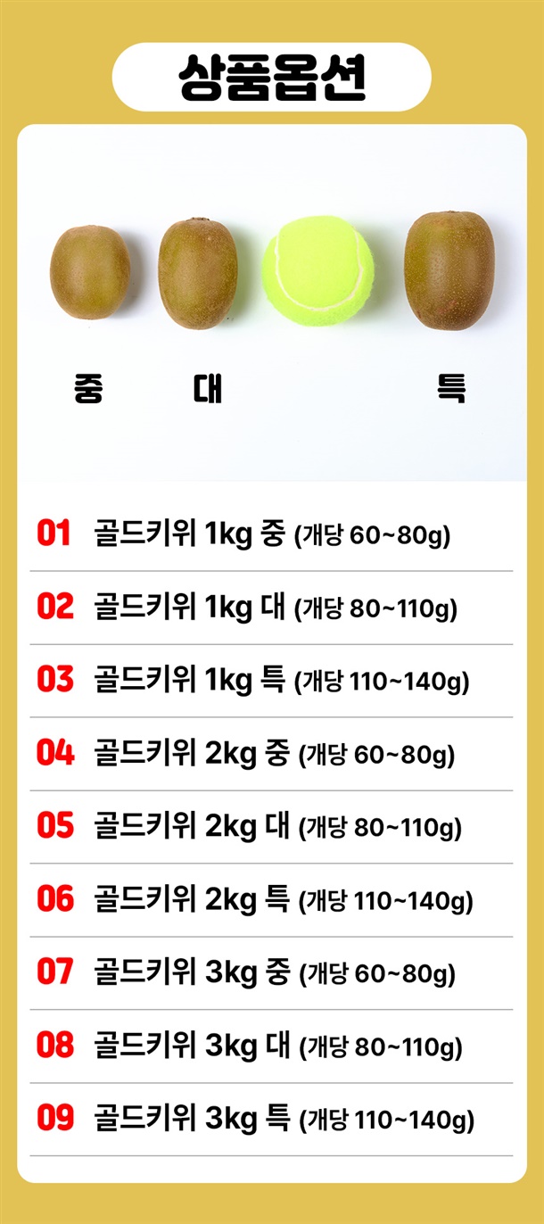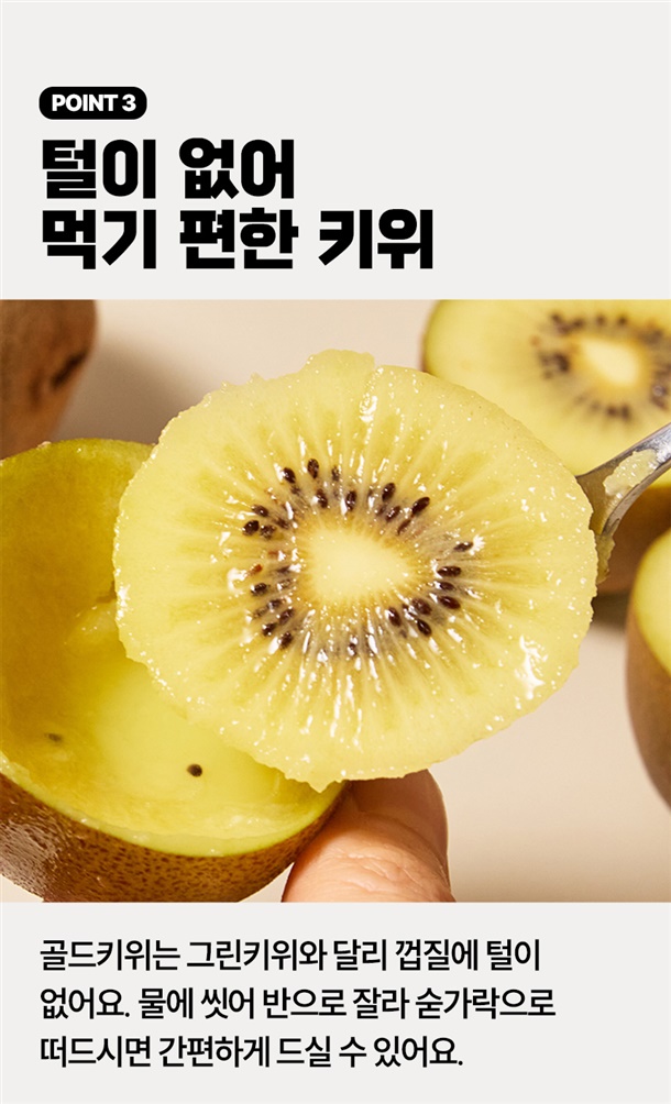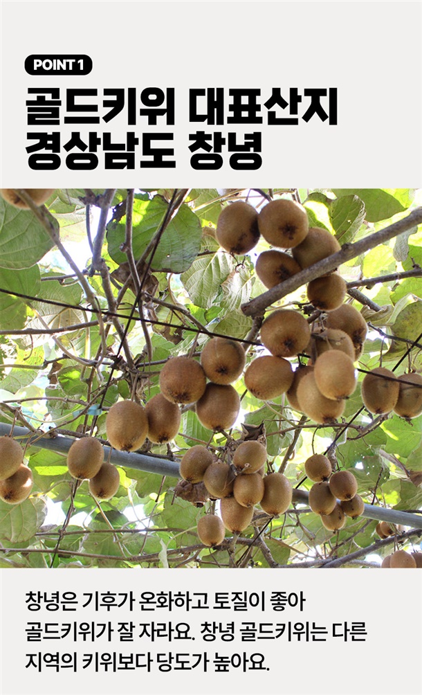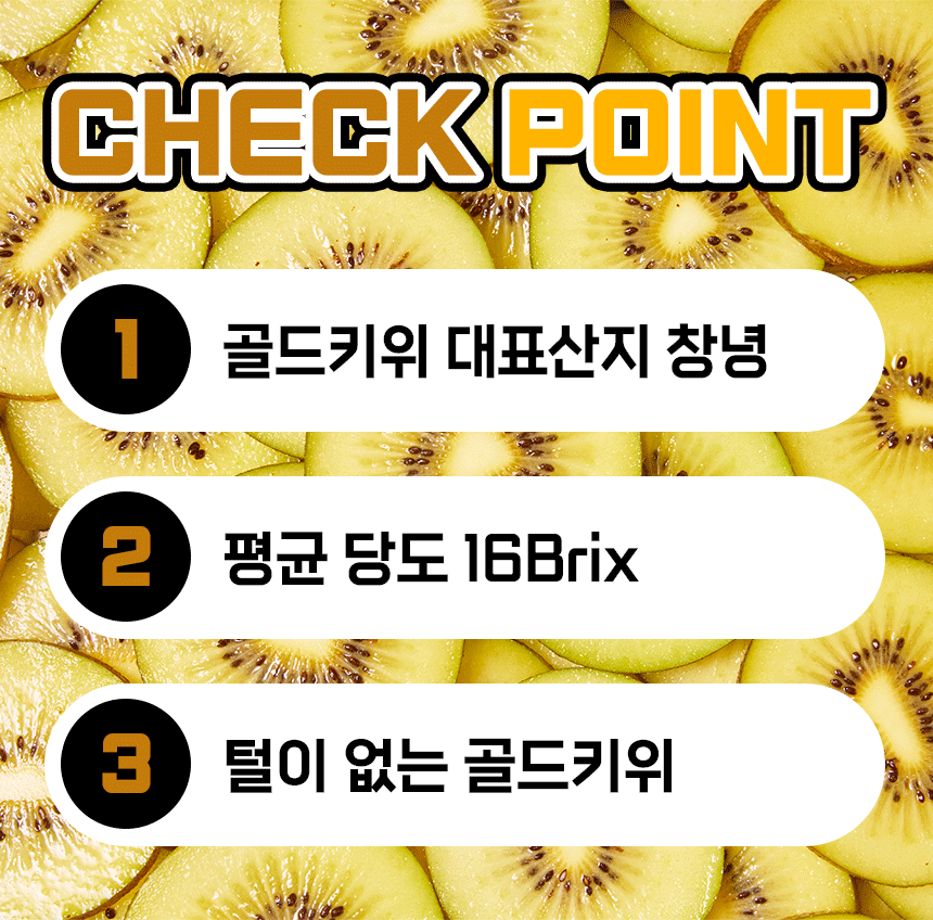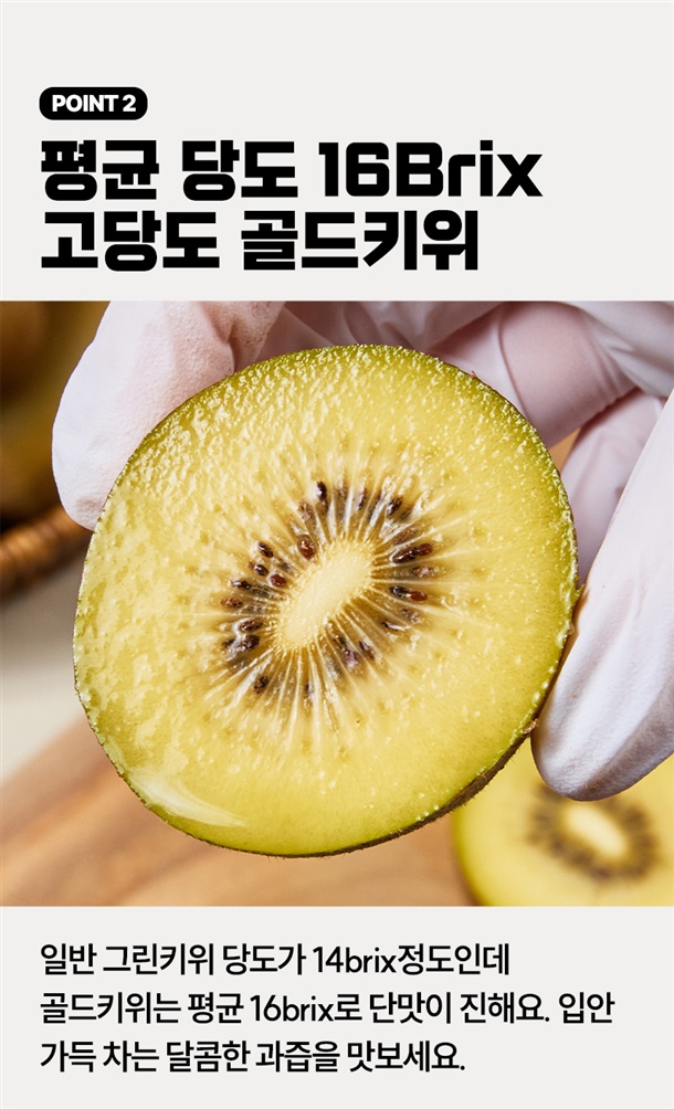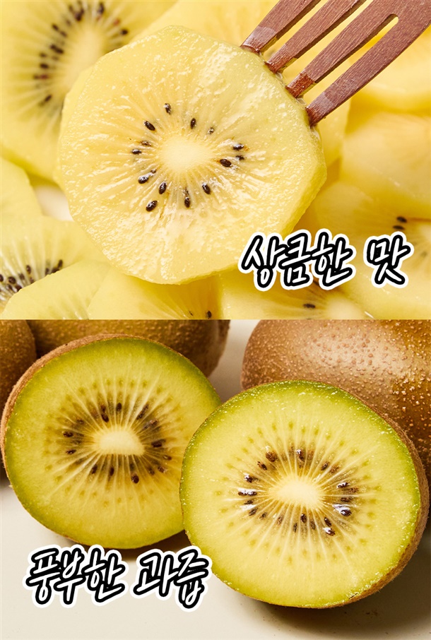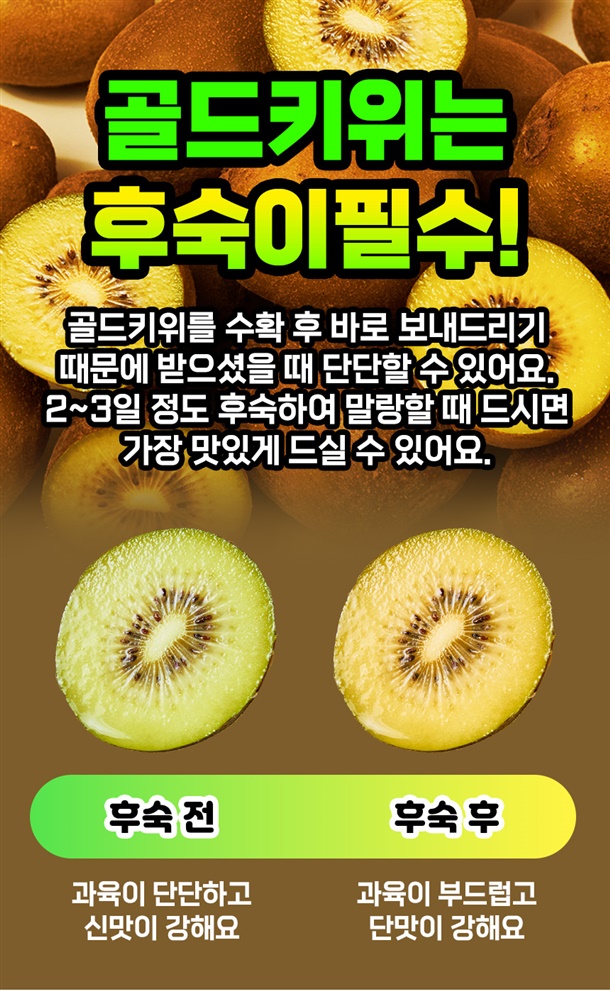 경남 창녕에서 재배한 평균 18brix의 고당도 골드키위예요. 후숙해서 드시면 과즙이 더 살아나 더욱 달콤하게 즐기실 수 있어요!
