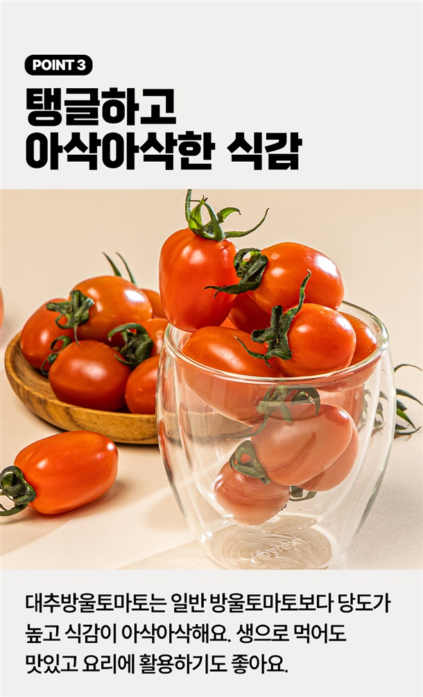 충남 논산 토마토 전문 생산자가 20년 이상 쌓아온 노하우로 365일 스마트팜에서 온도·습도·수분을 철저히 관리해 맛과 신선도를 모두 갖춘 대추방울토마를 선별해 보내드립니다.
