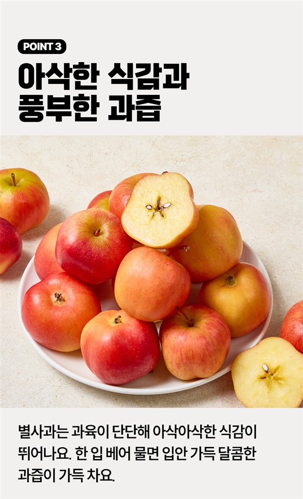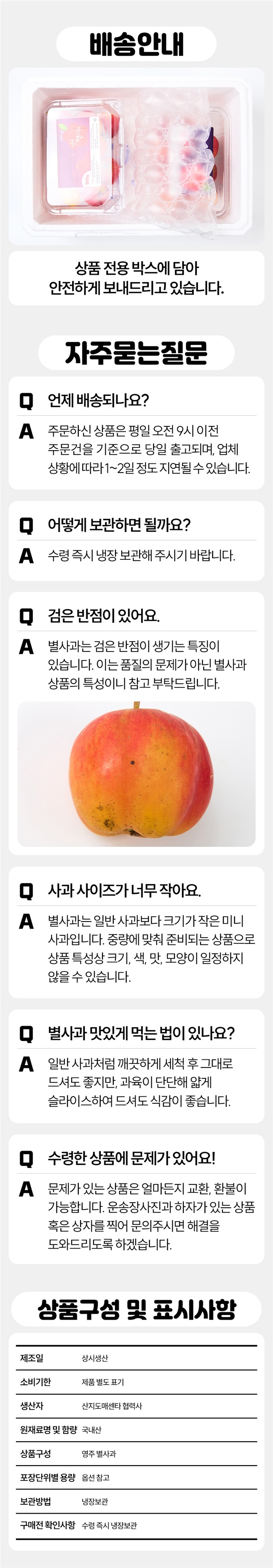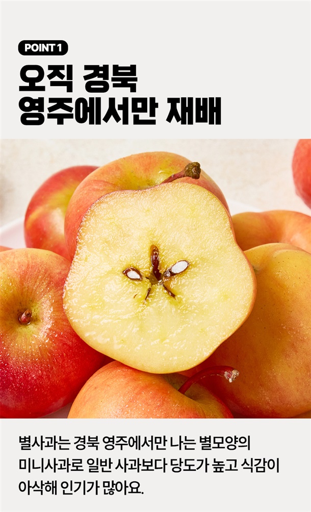 별사과는 소백산 영주 청정지역에서 재배되는 아주 귀한 사과로 전국 어디에서도 볼수 없고, 오직 경북 영주에서만 재배되는 특산품이에요! 순수 국내품종이며 사과모양이 별을 닮아서 아름답고도 당도 및 경도가 높아 장기간 보관도 가능해요~!