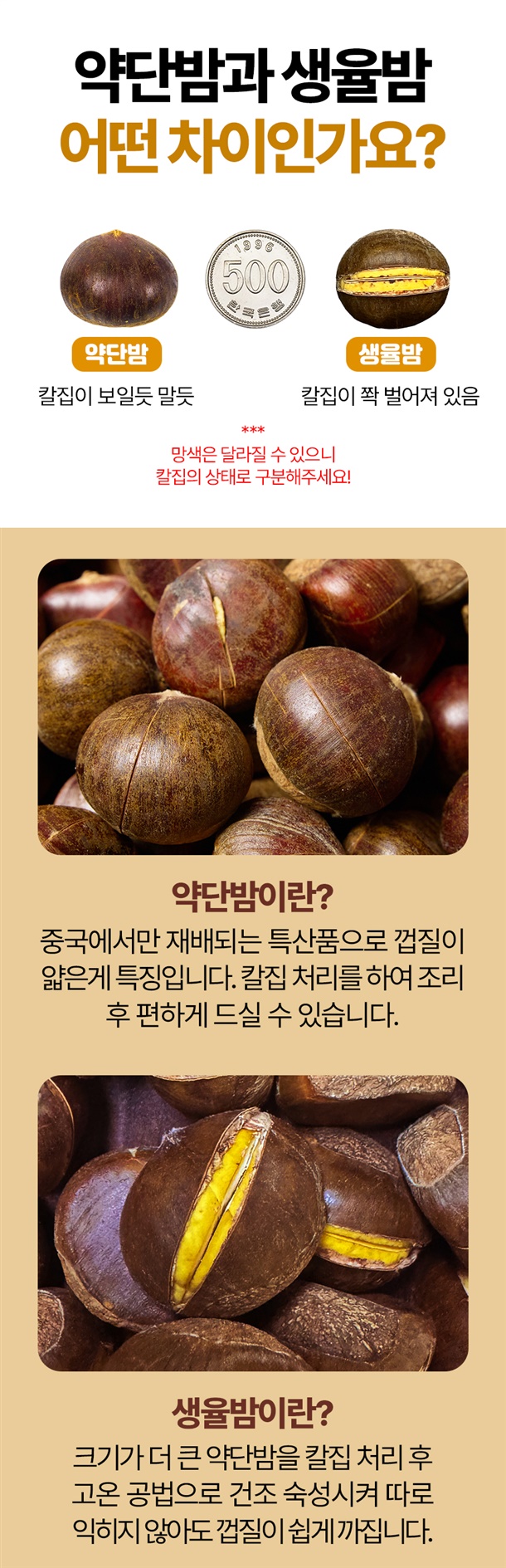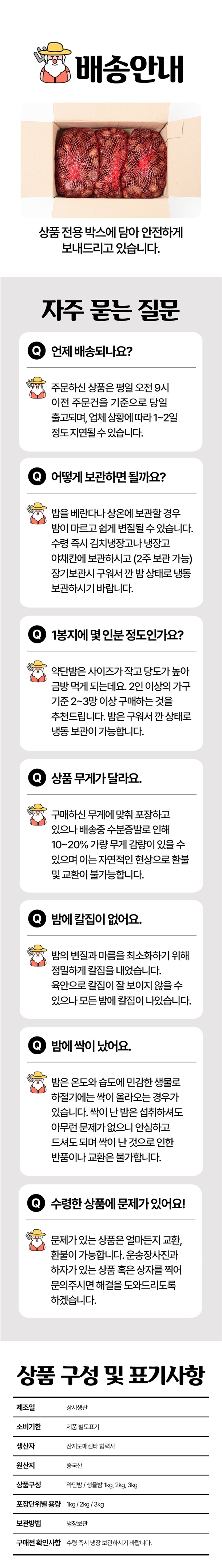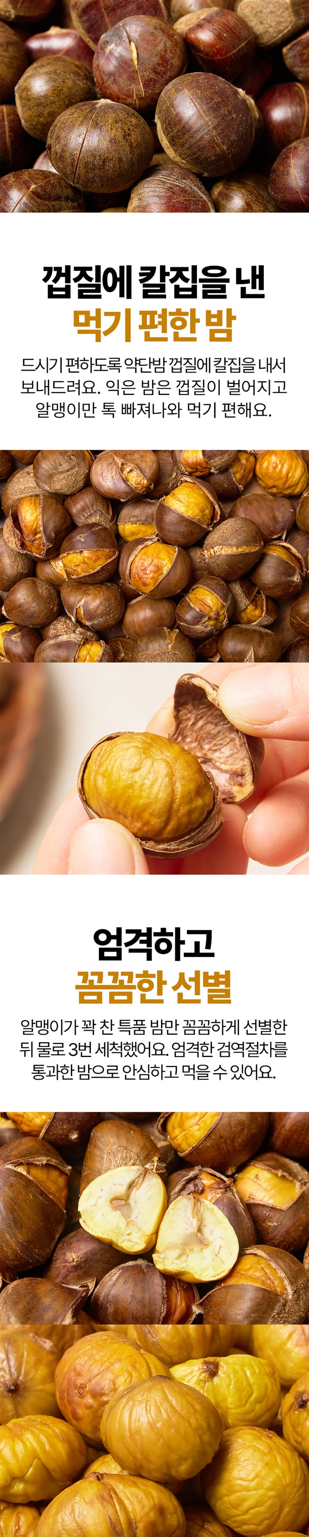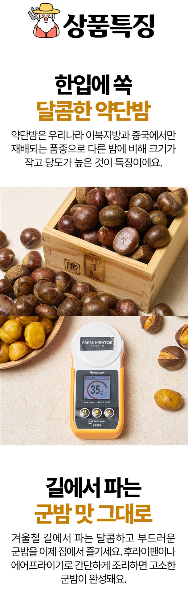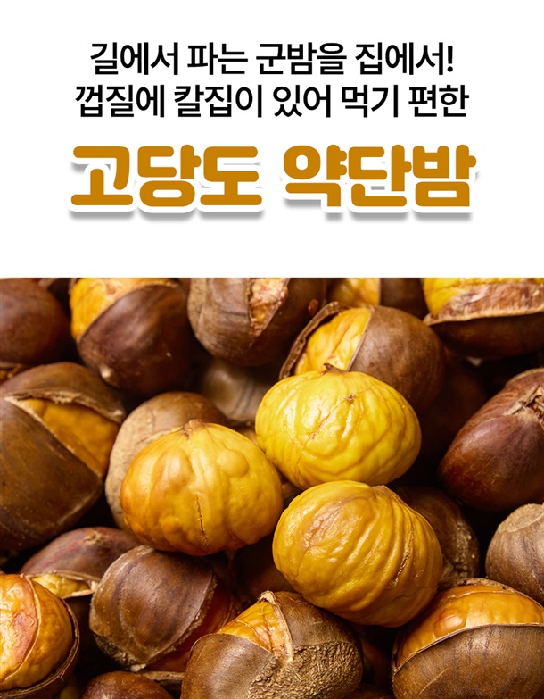 약단밤은 다른 밤에 비해 크기가 작고 당도가 최대 35브릭스까지 나오는게 특징이예요. 망고가 17브릭스라고 하니 망고보다 2배 달달하다고 생각하시면 됩니다. 후라이팬이나 에어프라이어로 간단하게 조리하면 고소한 군밤 완성! 엄격한 검역절차를 통과한 밤이라 안심하고 주문하세요.