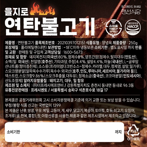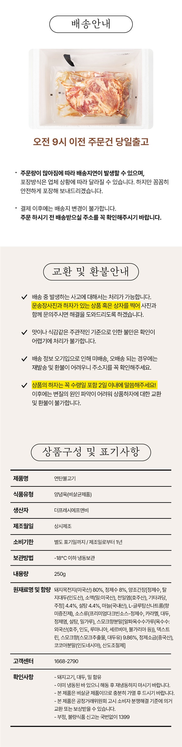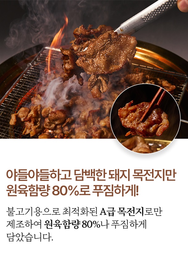 인기가 식을줄을 몰라요~ 이제는 입소문까지 나서 벌써 20번째 재입고했습니다. 식당가면 만원짜리 4천원도 안되는 가격으로 정말 인기가 많아요! 부드러운 목전지를 30시간 이상 숙성해서 양념이 잘 배어있구요~ 리뷰 보시면 고기 연하고 불맛 좋다고 칭찬이 자자합니다~