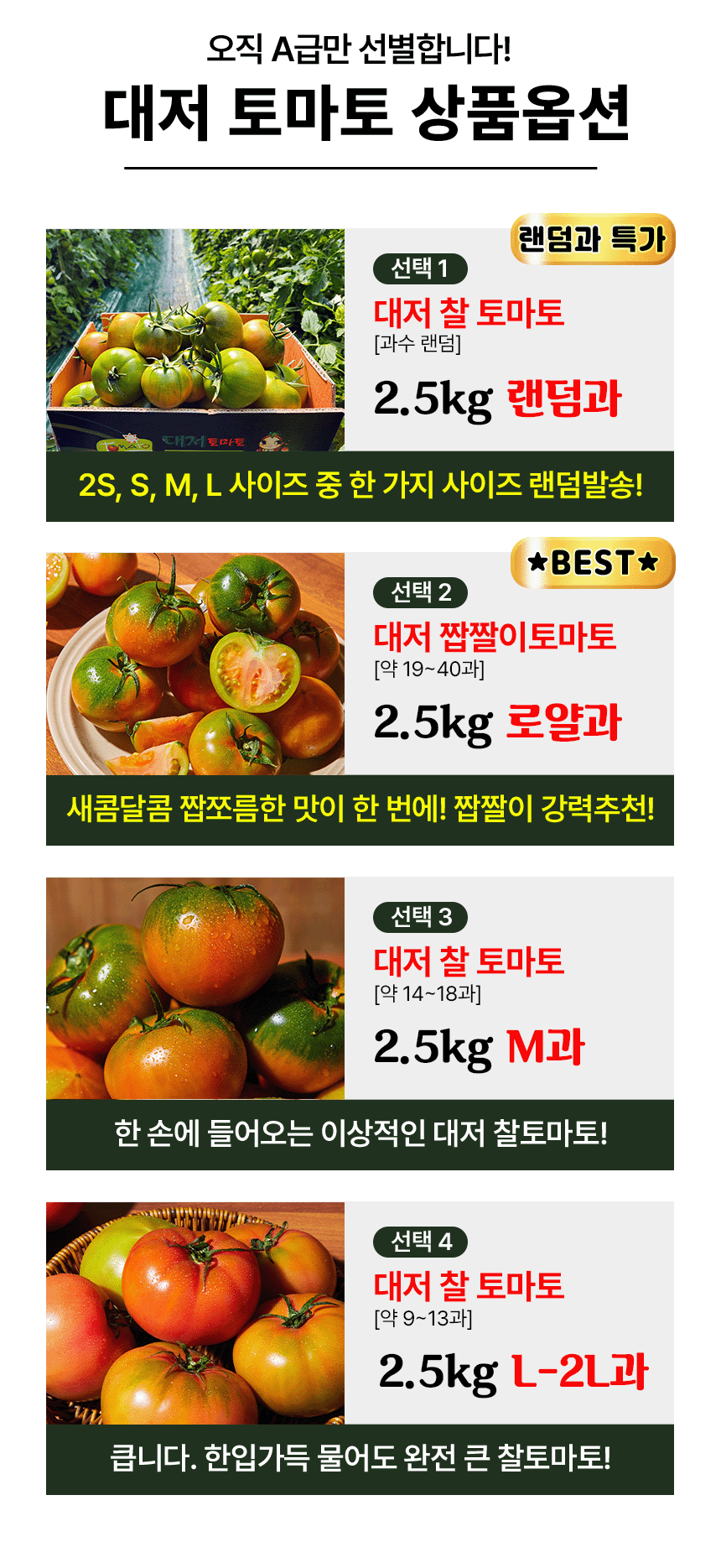 지금이 아니면 1년을 기다려야하는 짭짤이토마토! 첫 수확 시작했습니다~! 다른 곳에서는 드셔보기 어려운 부산의 명물 대저토마토 가져왔어요~ 가격은 좀 비싸더라도 확실한 단짠단짠 토마토맛을 느끼고 싶으신분들은 짭짤이토마토 옵션을 선택해주세요~